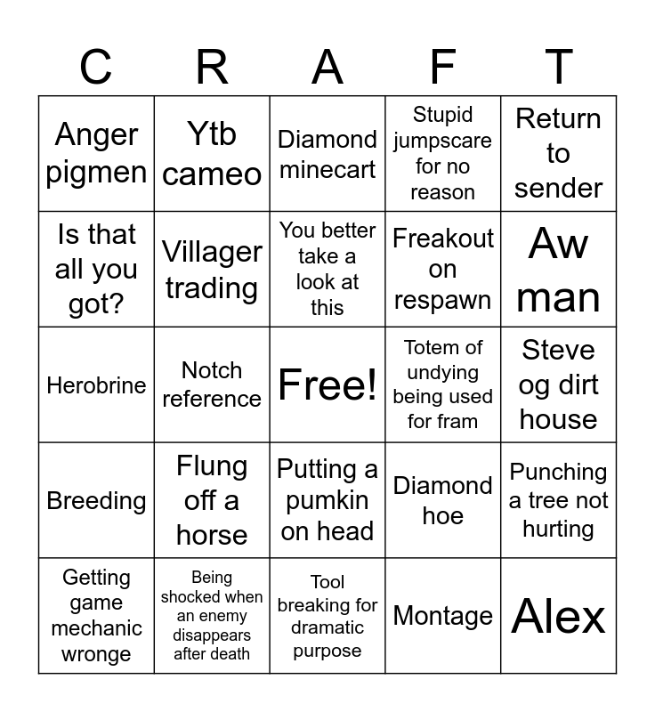 This bingo card has a free space and 24 words: Flung off a horse, Being shocked when an enemy disappears after death, You better take a look at this, Getting game mechanic wronge, Return to sender, Anger pigmen, Is that all you got?, Ytb cameo, Totem of undying being used for fram, Putting a pumkin on head, Freakout on respawn, Herobrine, Diamond hoe, Punching a tree not hurting, Villager trading, Montage, Steve og dirt house, Diamond minecart, Aw man, Notch reference, Alex, Breeding, Stupid jumpscare for no reason and Tool breaking for dramatic purpose.