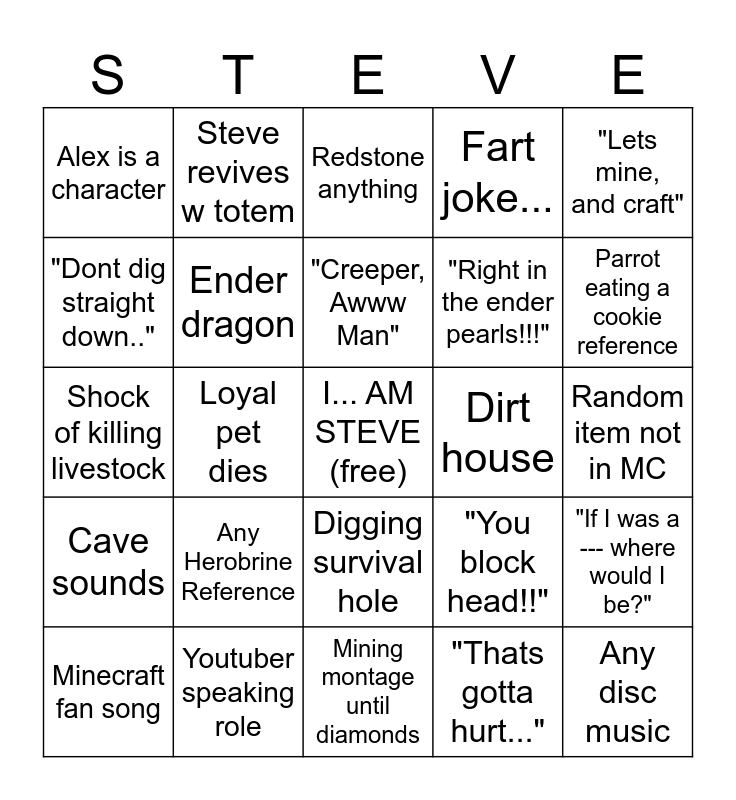 This bingo card has a free space and 24 words: Any Herobrine Reference, Youtuber speaking role, "Creeper, Awww Man", Minecraft fan song, "Lets mine, and craft", Alex is a character, "Dont dig straight down..", Steve revives w totem, Dirt house, Digging survival hole, "Right in the ender pearls!!!", Shock of killing livestock, "You block head!!", "If I was a --- where would I be?", Ender dragon, "Thats gotta hurt...", Random item not in MC, Redstone anything, Parrot eating a cookie reference, Loyal pet dies, Any disc music, Cave sounds, Fart joke... and Mining montage until diamonds.