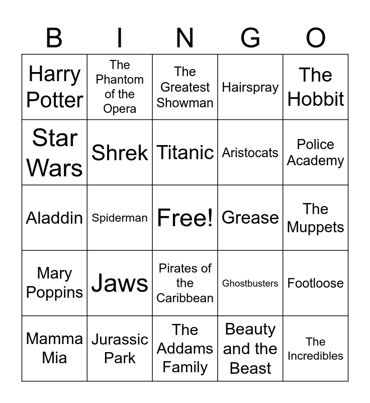 This bingo card has a free space and 24 words: Jaws, Jurassic Park, Titanic, Mamma Mia, The Hobbit, Harry Potter, Star Wars, The Phantom of the Opera, Grease, Pirates of the Caribbean, Aristocats, Aladdin, Ghostbusters, Footloose, Shrek, Beauty and the Beast, The Muppets, The Greatest Showman, Police Academy, Spiderman, The Incredibles, Mary Poppins, Hairspray and The Addams Family.