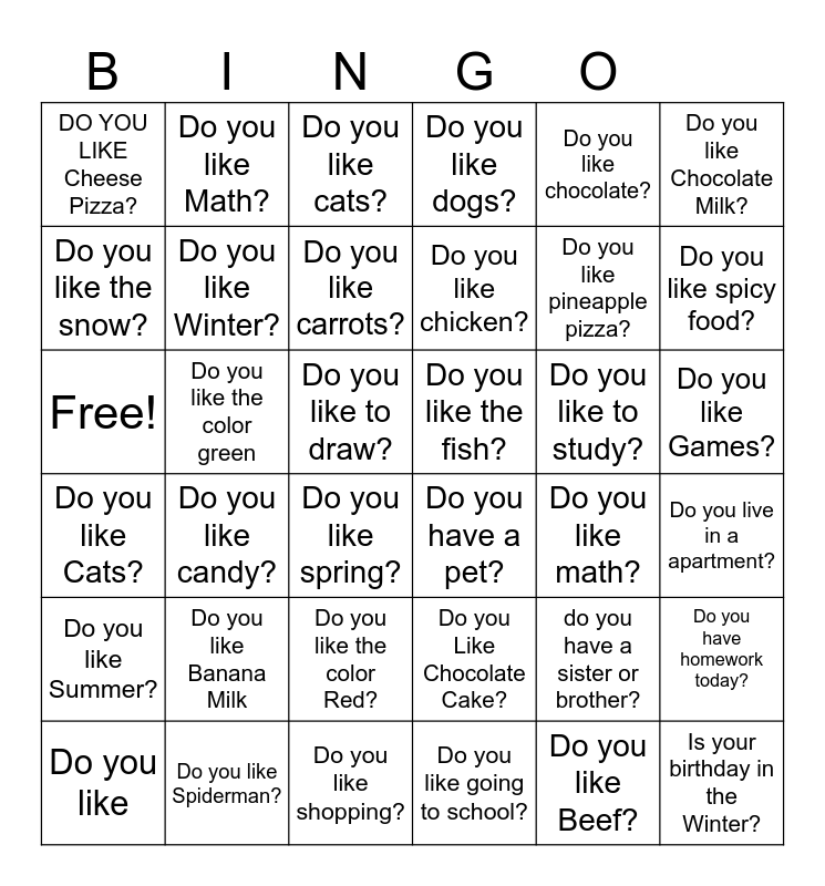 This bingo card has 36 words: Do you Like Chocolate Cake?, Do you like the color Red?, Do you like going to school?, Do you like the snow?, Do you like Cats?, Do you like the fish?, Do you like Winter?, Do you like shopping?, Do you like chocolate?, do you have a sister or brother?, Do you like spicy food?, Do you like dogs?, Do you have homework today?, Do you like the color green, Do you like chicken?, DO YOU LIKE Cheese Pizza?, Do you like Summer?, Do you like to study?, Free!, Do you like cats?, Do you like to draw?, Do you like candy?, Do you have a pet?, Do you like spring?, Do you like math?, Do you like Math?, Do you like pineapple pizza?, Do you like Spiderman?, Do you like carrots?, Do you like Chocolate Milk?, Is your birthday in the Winter?, Do you like, Do you live in a apartment?, Do you like Games?, Do you like Banana Milk and Do you like Beef?.