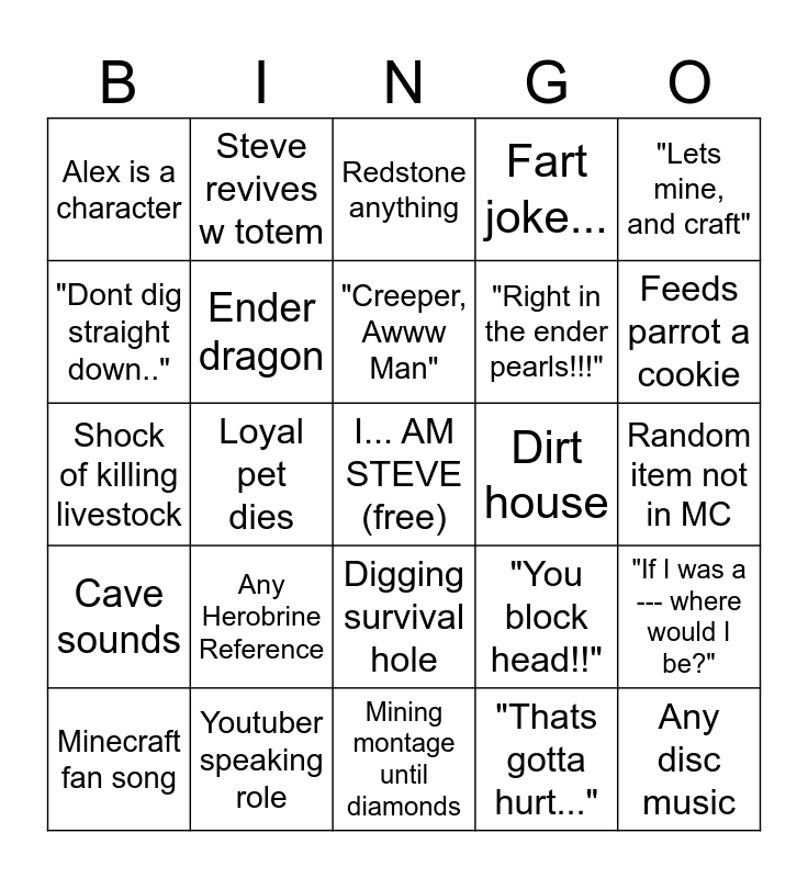 This bingo card has a free space and 24 words: Any Herobrine Reference, Youtuber speaking role, "Creeper, Awww Man", Minecraft fan song, "Lets mine, and craft", Alex is a character, "Dont dig straight down..", Steve revives w totem, Dirt house, Digging survival hole, "Right in the ender pearls!!!", Shock of killing livestock, "You block head!!", "If I was a --- where would I be?", Ender dragon, "Thats gotta hurt...", Random item not in MC, Redstone anything, Feeds parrot a cookie, Loyal pet dies, Any disc music, Cave sounds, Fart joke... and Mining montage until diamonds.
