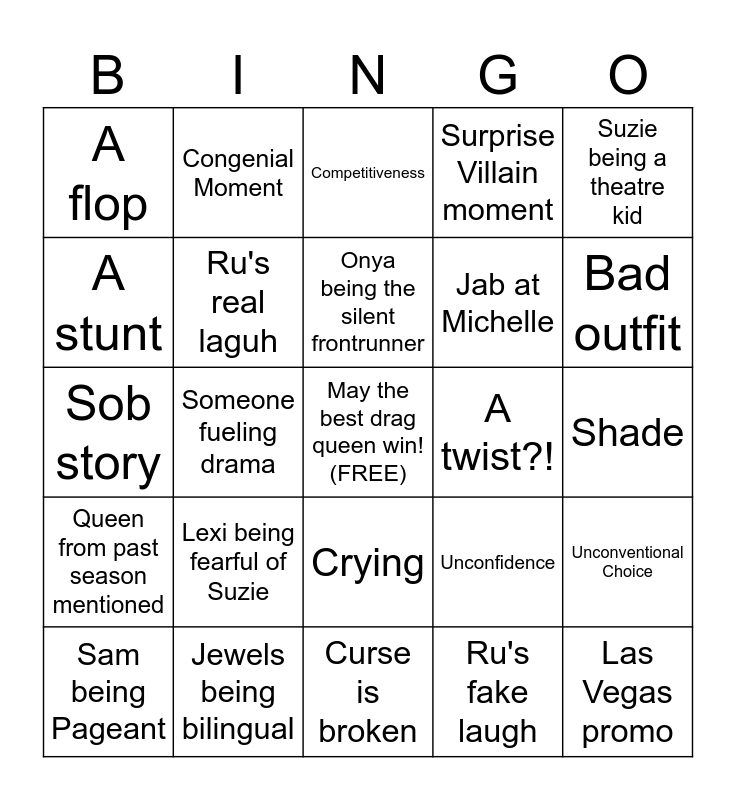 This bingo card has a free space and 24 words: Lexi being fearful of Suzie, Jewels being bilingual, Onya being the silent frontrunner, Sam being Pageant, Suzie being a theatre kid, A flop, A stunt, Congenial Moment, A twist?!, Crying, Jab at Michelle, Sob story, Unconfidence, Unconventional Choice, Ru's real laguh, Ru's fake laugh, Shade, Competitiveness, Bad outfit, Someone fueling drama, Las Vegas promo, Queen from past season mentioned, Surprise Villain moment and Curse is broken.
