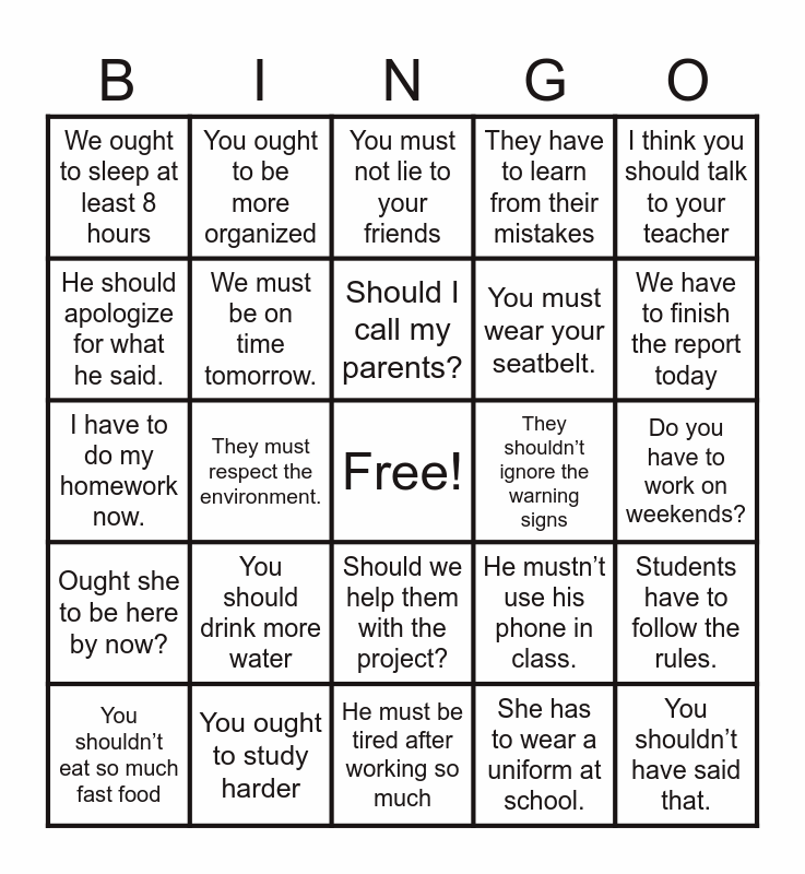 This bingo card has a free space and 24 words: You should drink more water, You ought to study harder, Should I call my parents?, You shouldn’t eat so much fast food, I think you should talk to your teacher, We ought to sleep at least 8 hours, He should apologize for what he said., You ought to be more organized, They shouldn’t ignore the warning signs, Should we help them with the project?, You must wear your seatbelt., I have to do my homework now., He mustn’t use his phone in class., Students have to follow the rules., We must be on time tomorrow., She has to wear a uniform at school., Do you have to work on weekends?, You must not lie to your friends, We have to finish the report today, They must respect the environment., You shouldn’t have said that., Ought she to be here by now?, They have to learn from their mistakes and He must be tired after working so much.
