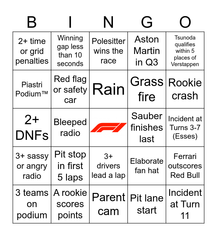 This bingo card has a free space and 27 words: Elaborate fan hat, Cherry blossom trees, Grass fire, Parent cam, Piastri Podium™️, Polesitter wins the race, Winning gap less than 10 seconds, 3+ sassy or angry radio, Sauber finishes last, Ferrari outscores Red Bull, 2+ DNFs, Aston Martin in Q3, 3 teams on podium, A rookie scores points, Rookie crash, A rookie outqualifies their teammate, Red flag or safety car, Rain, Pit stop in first 5 laps, 2+ time or grid penalties, Incident at Turns 3-7 (Esses), Pit lane start, Bleeped radio, Incident at Turn 11, 3+ drivers lead a lap, Tsunoda qualifies within 5 places of Verstappen and Incident at Turns 16-19.