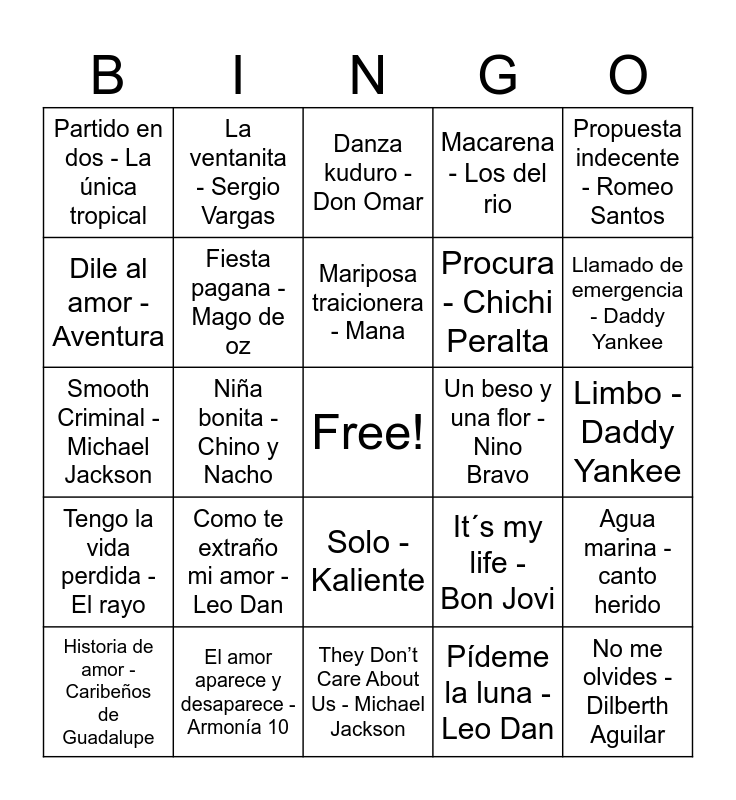 This bingo card has a free space and 24 words: Como te extraño mi amor - Leo Dan, El amor aparece y desaparece - Armonía 10, Mariposa traicionera - Mana, Historia de amor - Caribeños de Guadalupe, Propuesta indecente - Romeo Santos, Partido en dos - La única tropical, Dile al amor - Aventura, La ventanita - Sergio Vargas, Un beso y una flor - Nino Bravo, Solo - Kaliente, Procura - Chichi Peralta, Smooth Criminal - Michael Jackson, It´s my life - Bon Jovi, Agua marina - canto herido, Fiesta pagana - Mago de oz, Pídeme la luna - Leo Dan, Limbo - Daddy Yankee, Danza kuduro - Don Omar, Llamado de emergencia - Daddy Yankee, Niña bonita - Chino y Nacho, No me olvides - Dilberth Aguilar, Tengo la vida perdida - El rayo, Macarena - Los del rio and They Don’t Care About Us - Michael Jackson.