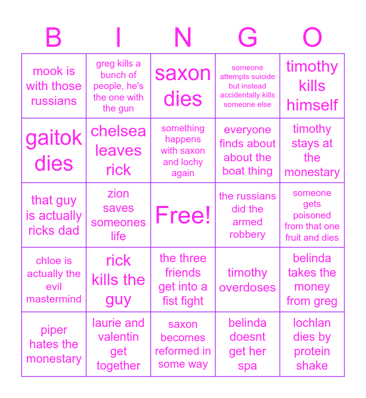 This bingo card has a free space and 24 words: rick kills the guy, laurie and valentin get together, something happens with saxon and lochy again, piper hates the monestary, timothy kills himself, mook is with those russians, gaitok dies, greg kills a bunch of people, he's the one with the gun, the russians did the armed robbery, the three friends get into a fist fight, everyone finds about about the boat thing, that guy is actually ricks dad, timothy overdoses, belinda takes the money from greg, chelsea leaves rick, belinda doesnt get her spa, someone gets poisoned from that one fruit and dies, saxon dies, timothy stays at the monestary, zion saves someones life, lochlan dies by protein shake, chloe is actually the evil mastermind, someone attempts suicide but instead accidentally kills someone else and saxon becomes reformed in some way.