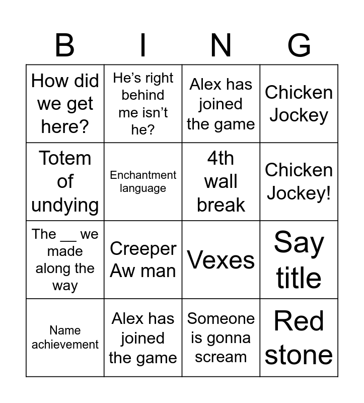 This bingo card has 18 words: Creeper Aw man, Red stone, Alex has joined the game, How did we get here?, Vexes, Chicken Jockey, Name achievement, He’s right behind me isn’t he?, Chicken Jockey!, The __ we made along the way, Someone is gonna scream, Totem of undying, Say title, Enchantment language, 4th wall break, I am Steve chant, Alex has joined the game and DanTDM.