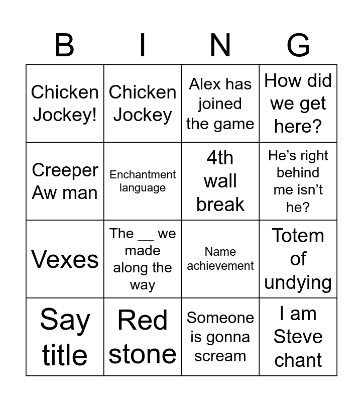 This bingo card has 18 words: Creeper Aw man, Red stone, Alex has joined the game, How did we get here?, Vexes, Chicken Jockey, Name achievement, He’s right behind me isn’t he?, Chicken Jockey!, The __ we made along the way, Someone is gonna scream, Totem of undying, Say title, Enchantment language, 4th wall break, I am Steve chant, Alex has joined the game and DanTDM.