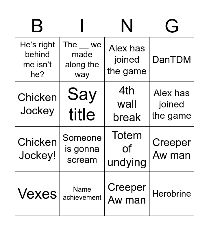 This bingo card has 20 words: Creeper Aw man, Red stone, Alex has joined the game, How did we get here?, Vexes, Chicken Jockey, Name achievement, He’s right behind me isn’t he?, Chicken Jockey!, The __ we made along the way, Someone is gonna scream, Totem of undying, Say title, Herobrine, 4th wall break, I am Steve chant, Alex has joined the game, DanTDM, Creeper Aw man and Creeper Aw man.
