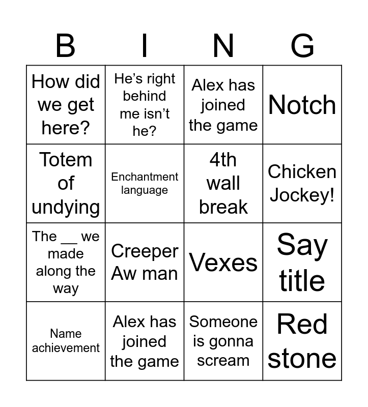 This bingo card has 18 words: Creeper Aw man, Red stone, Alex has joined the game, How did we get here?, Vexes, Notch, Name achievement, He’s right behind me isn’t he?, Chicken Jockey!, The __ we made along the way, Someone is gonna scream, Totem of undying, Say title, Enchantment language, 4th wall break, I am Steve chant, Alex has joined the game and DanTDM.
