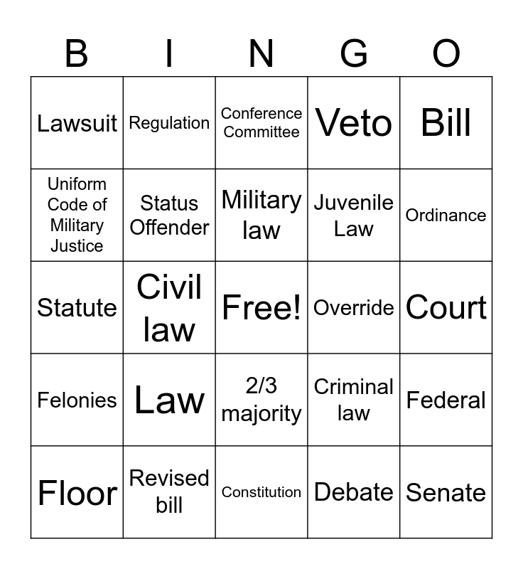 This bingo card has a free space and 44 words: House of Representative, Senate, Committee, Floor, Vote, Debate, Conference Committee, Final Approval, Bill, Revised bill, Veto, Override, 2/3 majority, Law, President, Constitution, Supreme law, Statute, United States Code, Ordinance, Regulation, Agency, Congress, Lawsuit, Precedent, Court, Interpretation, Supreme Court, Criminal law, Felonies, Misdemeanors, Federal, State, Local, Civil law, Judge, Jury, Case, Military law, Uniform Code of Military Justice, Juvenile Law, Delinquent, Status Offender and Child Protective Services.