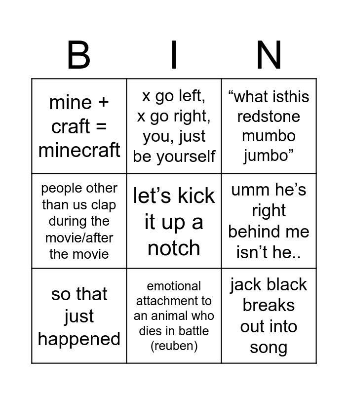 This bingo card has a free space and 8 words: umm he’s right behind me isn’t he.., “what isthis redstone mumbo jumbo”, x go left, x go right, you, just be yourself, so that just happened, mine + craft = minecraft, jack black breaks out into song, people other than us clap during the movie/after the movie and emotional attachment to an animal who dies in battle (reuben).