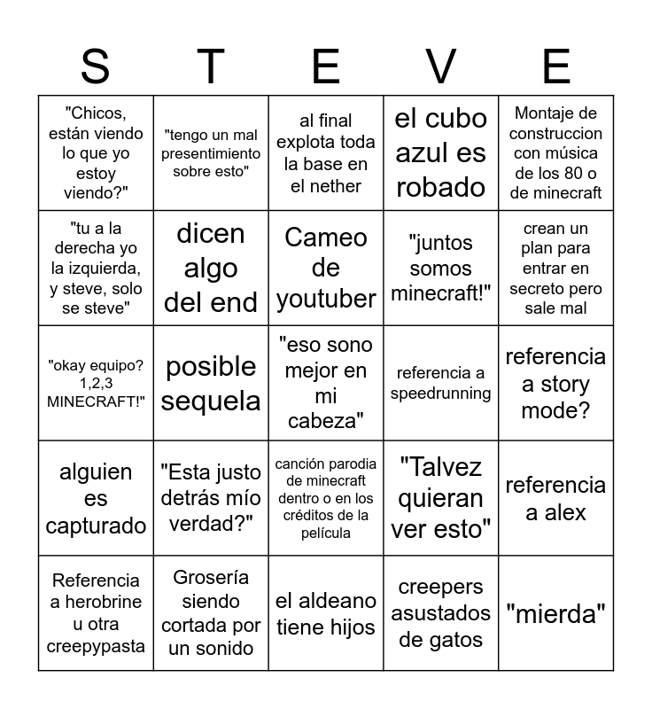 This bingo card has a free space and 24 words: "Esta justo detrás mío verdad?", Grosería siendo cortada por un sonido, Cameo de youtuber, Referencia a herobrine u otra creepypasta, Montaje de construccion con música de los 80 o de minecraft, "Chicos, están viendo lo que yo estoy viendo?", "tu a la derecha yo la izquierda, y steve, solo se steve", "tengo un mal presentimiento sobre esto", referencia a speedrunning, canción parodia de minecraft dentro o en los créditos de la película, "juntos somos minecraft!", "okay equipo? 1,2,3 MINECRAFT!", "Talvez quieran ver esto", referencia a alex, dicen algo del end, creepers asustados de gatos, referencia a story mode?, al final explota toda la base en el nether, crean un plan para entrar en secreto pero sale mal, posible sequela, "mierda", alguien es capturado, el cubo azul es robado and el aldeano tiene hijos.