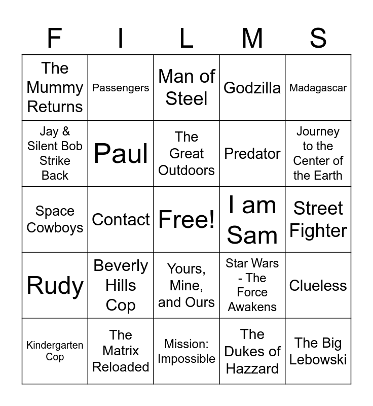 This bingo card has a free space and 64 words: Training Day, Cabin in the Woods, Aeon Flux, Clueless, Cloverfield, Gods of Egypt, Passengers, Split, The Great Outdoors, Bee Movie, Yours, Mine, and Ours, American Gangster, Street Fighter, Madagascar, Spanglish, Jay & Silent Bob Strike Back, Contact, The Mummy Returns, Draft Day, Predator, Beverly Hills Cop, Rudy, Godzilla, Elysium, S.W.A.T., Finding Neverland, Uncommon Valor, A Knights Tale, That thing you do!, Step Brothers, The Day the Earth Stood Still, Stripes, Pineapple Express, The Jerk, Journey to the Center of the Earth, Kindergarten Cop, Deep Impact, The Dukes of Hazzard, Sweeney Todd, Paul, Space Cowboys, I am Sam, Trading Places, The Karate Kid, Men of Honor, The Big Lebowski, The Matrix Reloaded, Alice Through the Glass, Star Wars - The Force Awakens, Short Circuit, Cowboys & Aliens, The Waterboy, Mission: Impossible, Chain Reaction, Copycat, Avatar, Man of Steel, 1941, Zodiac, Get Smart, Donnie Brasco, Robots, Insomnia and Maverick.