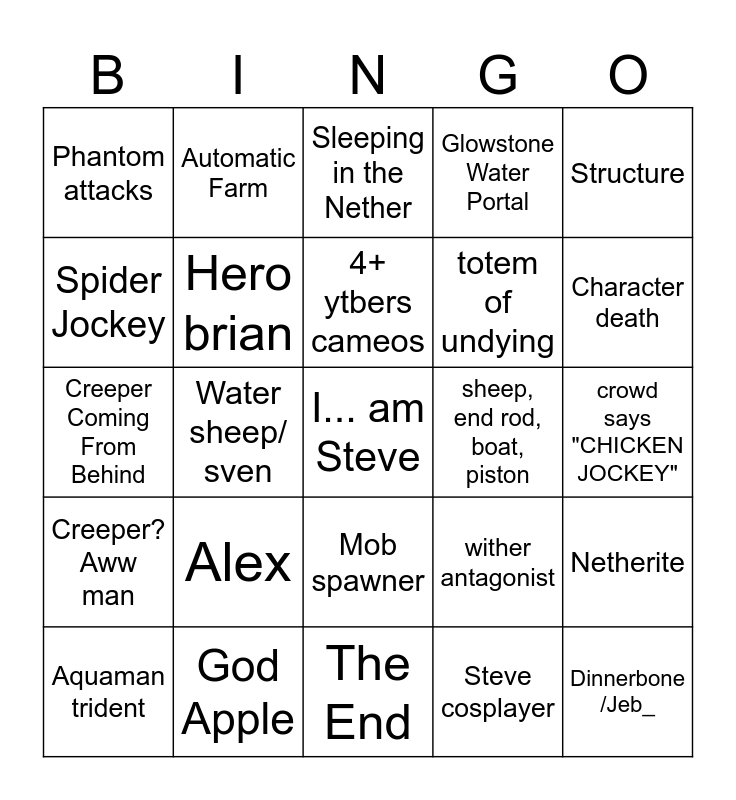 This bingo card has a free space and 27 words: wither antagonist, minecraft songs, totem of undying, The End, Spider Jockey, Sleeping in the Nether, Automatic Farm, Creeper? Aww man, sheep, end rod, boat, piston, Netherite, Creeper Coming From Behind, Glowstone Water Portal, Aquaman trident, God Apple, Character death, Mob Vote Reference, Hero brian, 4+ ytbers cameos, Alex, Phantom attacks, crowd says "CHICKEN JOCKEY", Steve cosplayer, Water sheep/ sven, Dinnerbone /Jeb_, Mob spawner, Structure and Pillagers.