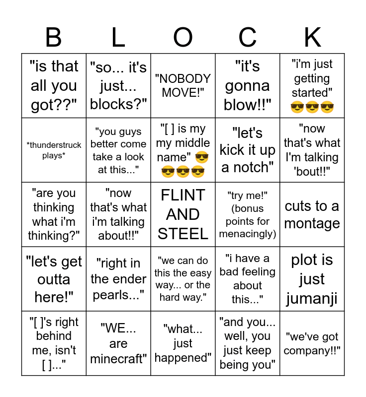 This bingo card has a free space and 29 words: "[ ]'s right behind me, isn't [ ]...", "that sounded better in my head...", "now that's what i'm talking about!!", "aww man", "is that all you got??", "NOBODY MOVE!", "you guys better come take a look at this...", "right in the ender pearls...", "try me!" (bonus points for menacingly), "WE... are minecraft", cuts to a montage, "we've got company!!", "what... just happened", "and you... well, you just keep being you", "now that's what I'm talking 'bout!!", jack black singing for genuinely no reason, "we can do this the easy way... or the hard way.", "let's get outta here!", "i'm just getting started" 😎😎😎, "are you thinking what i'm thinking?", "i have a bad feeling about this...", "it's quiet... too quiet", "let's kick it up a notch", *thunderstruck plays*, "it's gonna blow!!", "so... it's just... blocks?", plot is just jumanji, "[ ] is my my middle name" 😎😎😎😎 and "don't do anything stupid!".