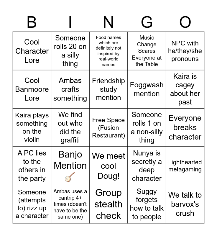This bingo card has a free space and 24 words: Banjo Mention 🪕, Ambas uses a cantrip 4+ times (doesn't have to be the same one), Friendship study mention, Someone (attempts to) rizz up a character, NPC with he/they/she pronouns, Cool Character Lore, Cool Banmoore Lore, Someone rolls 20 on a silly thing, Someone rolls 1 on a non-silly thing, We meet cool Doug!, Foggwash mention, Kaira plays something on the violin, Nunya is secretly a deep character, Lighthearted metagaming, Ambas crafts something, Suggy forgets how to talk to people, Everyone breaks character, Food names which are definitely not inspired by real-world names, Kaira is cagey about her past, We find out who did the graffiti, We talk to barvox's crush, A PC lies to the others in the party, Music Change Scares Everyone at the Table and Group stealth check.