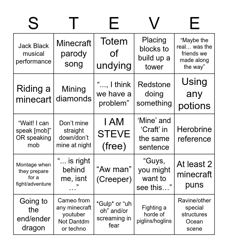 This bingo card has a free space and 24 words: “... is right behind me, isnt …”, Cameo from any minecraft youtuber Not Dantdm or techno, “..., I think we have a problem”, Going to the end/ender dragon, “Maybe the real… was the friends we made along the way”, Jack Black musical performance, Riding a minecart, Minecraft parody song, ‘Mine’ and ‘Craft’ in the same sentence, “Aw man” (Creeper), Redstone doing something, “Wait! I can speak [mob]” OR speaking mob, “Guys, you might want to see this…”, At least 2 minecraft puns, Mining diamonds, Fighting a horde of piglins/hoglins, Herobrine reference, Totem of undying, Using any potions, Don’t mine straight down/don’t mine at night, Ravine/other special structures Ocean scene, Montage when they prepare for a fight/adventure, Placing blocks to build up a tower and *Gulp* or “uh oh” and/or screaming in fear.