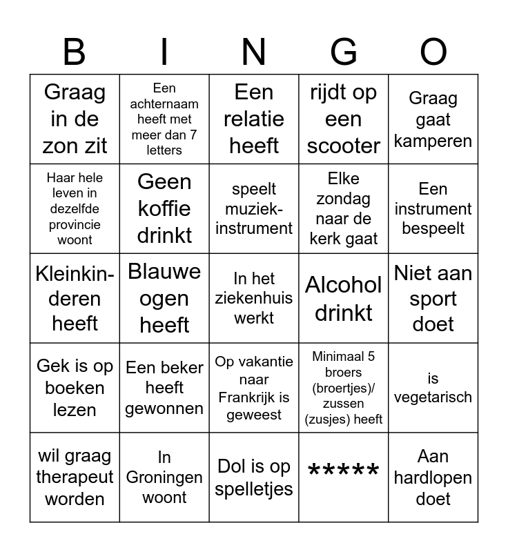 This bingo card has 30 words: In Groningen woont, Een huisdier heeft, Blauwe ogen heeft, 3 talen spreekt, Graag in de zon zit, Een relatie heeft, Geen koffie drinkt, Op vakantie naar Frankrijk is geweest, Alcohol drinkt, Dol is op spelletjes, Niet aan sport doet, In het ziekenhuis werkt, *****, Aan hardlopen doet, Een instrument bespeelt, Series binge watched, Minimaal 5 broers (broertjes)/ zussen (zusjes) heeft, Gek is op boeken lezen, Een beker heeft gewonnen, Graag gaat kamperen, Kleinkin-deren heeft, Van de Hollandse pot houdt, Een achternaam heeft met meer dan 7 letters, Elke zondag naar de kerk gaat, Haar hele leven in dezelfde provincie woont, rijdt op een scooter, is vegetarisch, wil graag therapeut worden, speelt muziek-instrument and houdt van gamen.