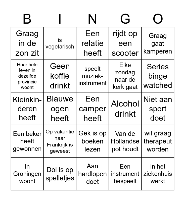 This bingo card has a free space and 29 words: In Groningen woont, Een huisdier heeft, Blauwe ogen heeft, 3 talen spreekt, Graag in de zon zit, Een relatie heeft, Geen koffie drinkt, Op vakantie naar Frankrijk is geweest, Alcohol drinkt, Dol is op spelletjes, Niet aan sport doet, In het ziekenhuis werkt, Aan hardlopen doet, Een instrument bespeelt, Series binge watched, Minimaal 5 broers (broertjes)/ zussen (zusjes) heeft, Gek is op boeken lezen, Een beker heeft gewonnen, Graag gaat kamperen, Kleinkin-deren heeft, Van de Hollandse pot houdt, Een achternaam heeft met meer dan 7 letters, Elke zondag naar de kerk gaat, Haar hele leven in dezelfde provincie woont, rijdt op een scooter, is vegetarisch, wil graag therapeut worden, speelt muziek-instrument and houdt van gamen.