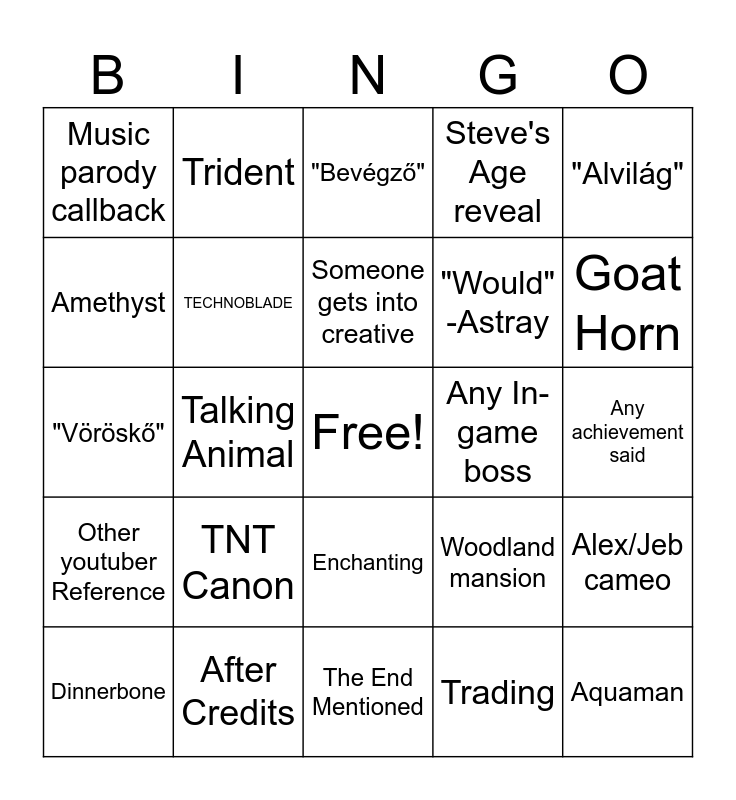 This bingo card has a free space and 24 words: TNT Canon, After Credits, Someone gets into creative, Dinnerbone, "Alvilág", Music parody callback, Amethyst, Trident, Any In-game boss, Enchanting, "Would" -Astray, "Vöröskő", Woodland mansion, Alex/Jeb cameo, TECHNOBLADE, Trading, Any achievement said, "Bevégző", Goat Horn, Talking Animal, Aquaman, Other youtuber Reference, Steve's Age reveal and The End Mentioned.