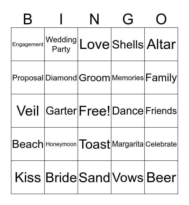 This bingo card has a free space and 24 words: Honeymoon, Bride, Groom, Kiss, Altar, Engagement, Proposal, Wedding Party, Dance, Toast, Memories, Veil, Margarita, Celebrate, Diamond, Vows, Friends, Love, Family, Garter, Beer, Beach, Shells and Sand.