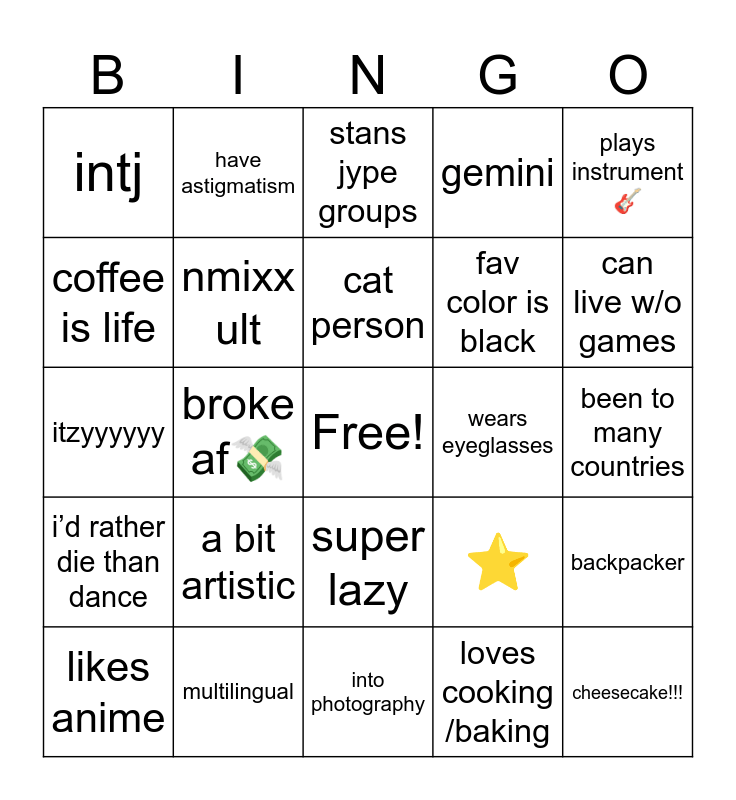 This bingo card has a free space and 25 words: a bit artistic, into photography, cat person, likes anime, plays instrument🎸, intj, coffee is life, have astigmatism, wears eyeglasses, super lazy, fav color is black, itzyyyyyy, ⭐️, backpacker, nmixx ult, likes bands 🎸🥁🎹, been to many countries, stans jype groups, can live w/o games, broke af💸, cheesecake!!!, multilingual, i’d rather die than dance, gemini and loves cooking /baking.