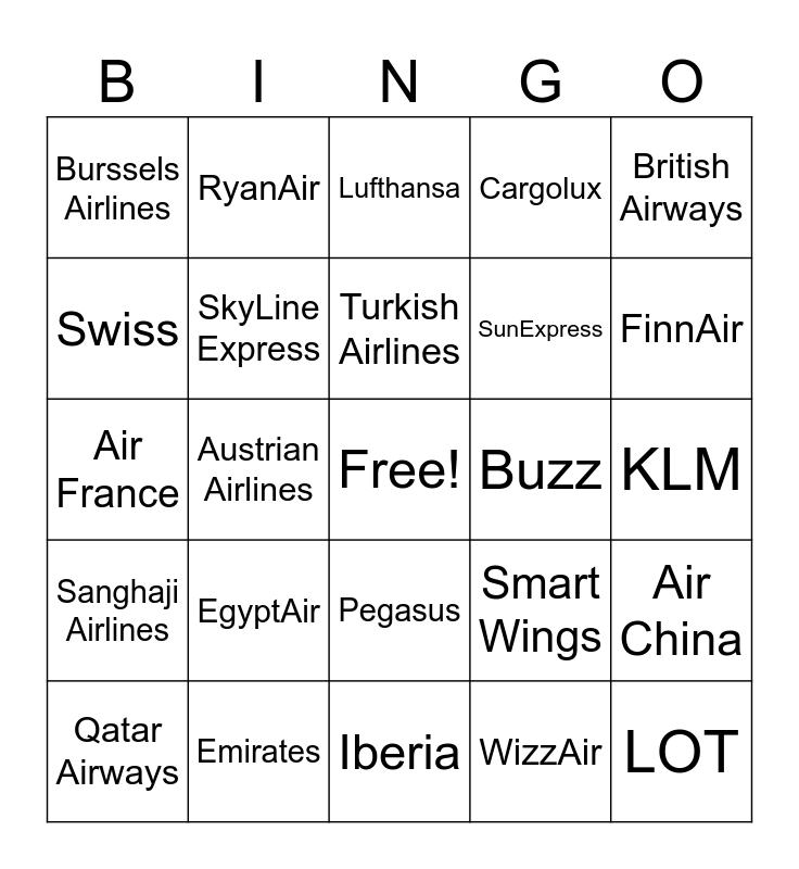 This bingo card has a free space and 24 words: EgyptAir, Emirates, Turkish Airlines, Qatar Airways, British Airways, Burssels Airlines, Swiss, RyanAir, Buzz, Pegasus, SunExpress, Air France, Smart Wings, Air China, SkyLine Express, WizzAir, KLM, Lufthansa, FinnAir, Austrian Airlines, LOT, Sanghaji Airlines, Cargolux and Iberia.