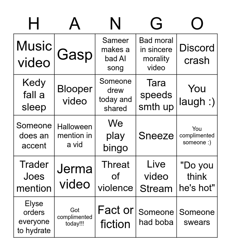 This bingo card has a free space and 82 words: Tara leaves wordlessly, Tomorrow's Teachings does smth outrageous, Sameer makes a bad AI song, Movie trailer, Someone is cooking, Pizazo mention, "I thought I was muted!!", Jollibee, Every haunt present, Salami, Someone has a wild story, History or geography, Blooper video, Sneeze, Brownie, Music video, Elyse orders everyone to hydrate, Kedy fall a sleep, Hour+ long video, Yawn, Steen is here, Tara speeds smth up, Someone swears, Discord crash, Halloween mention in a vid, My jeans, Play a non-bingo game, Someone streams to discord, Laugh snort, Katie heard thru Tara's mic, Jerma video, "Who put this on???", Someone does an accent, Someone makes a fun sound, Dubbing the sims, Fact or fiction, Game playthrough video, Angela!!!, You laugh :), Chat looks real weird if you weren't here lol, Someone sings!!!!, Bad moral in sincere morality video, Grocery shopping video, Cooking video, Someone's got a heathy snack, Gasp, Facecam, Someone drew today and shared, New nails pic today, Selfie posted today, Learned what people ate today, You complimented someone :), Got complimented today!!!, Group window shopping, Someone dreamt of another haunt, Still hanging past 12 PST, Cartoon, New dowsing rods vid, 3 vids from one channel, Live video Stream, It's bar, New Ann Reardon, Trader Joes mention, YTP, STOP. ____ING., Guess what Grace ate!!, Hear or see a cat, Glee mention, Hear urself thru Tara's mic lol, Fujo moment, Game trailer, Bald, Threat of violence, Someone had boba, 5MC, Satisfying compilation, Quiz vid, Someone picrewed today, Ghosts happen, Jollibee, "Do you think he's hot" and Someone working/ Doing HW.