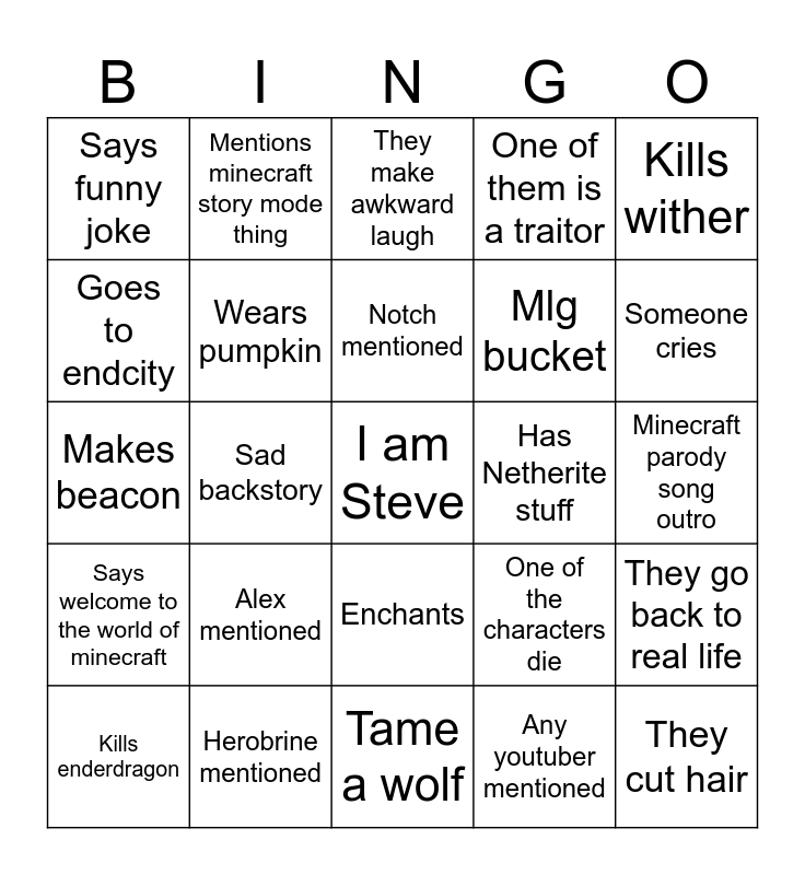 This bingo card has a free space and 24 words: Alex mentioned, Herobrine mentioned, Notch mentioned, Kills enderdragon, Kills wither, Says funny joke, Goes to endcity, Mentions minecraft story mode thing, Has Netherite stuff, Enchants, Mlg bucket, Makes beacon, One of the characters die, They go back to real life, Wears pumpkin, Any youtuber mentioned, Minecraft parody song outro, They make awkward laugh, Someone cries, Sad backstory, They cut hair, Says welcome to the world of minecraft, One of them is a traitor and Tame a wolf.