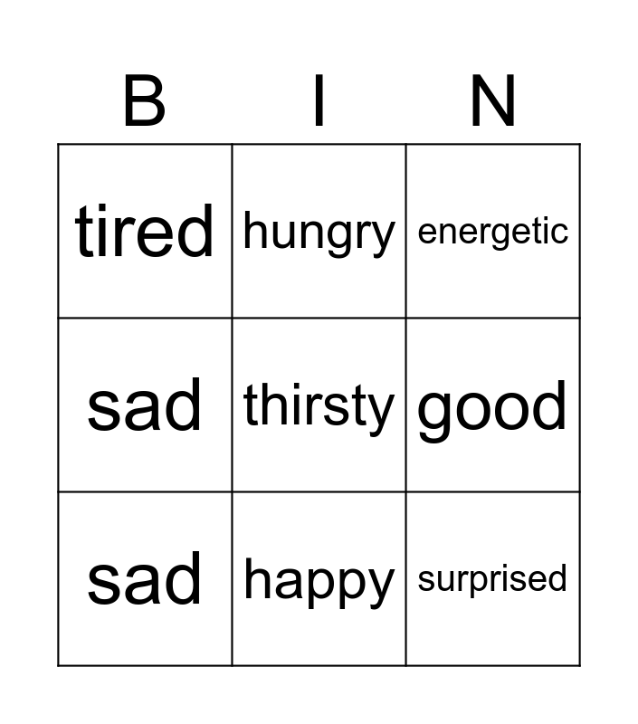 This bingo card has a free space and 11 words: angry, happy, surprised, sad, hungry, energetic, good, bad, sad, tired and unhappy.