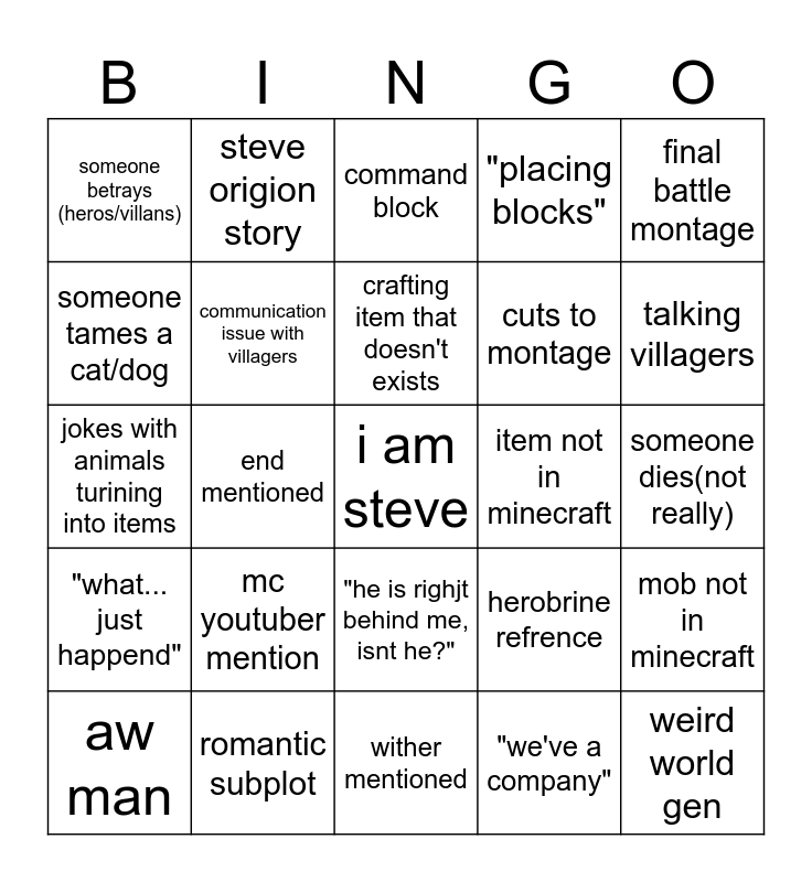 This bingo card has a free space and 24 words: mc youtuber mention, romantic subplot, crafting item that doesn't exists, aw man, final battle montage, someone betrays (heros/villans), someone tames a cat/dog, steve origion story, item not in minecraft, "he is righjt behind me, isnt he?", cuts to montage, jokes with animals turining into items, herobrine refrence, mob not in minecraft, communication issue with villagers, "we've a company", someone dies(not really), command block, talking villagers, end mentioned, weird world gen, "what... just happend", "placing blocks" and wither mentioned.