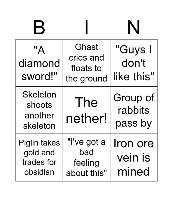 This bingo card has a free space and 8 words: Group of rabbits pass by, "Guys I don't like this", Ghast cries and floats to the ground, Piglin takes gold and trades for obsidian, "A diamond sword!", Iron ore vein is mined, Skeleton shoots another skeleton and "I've got a bad feeling about this".