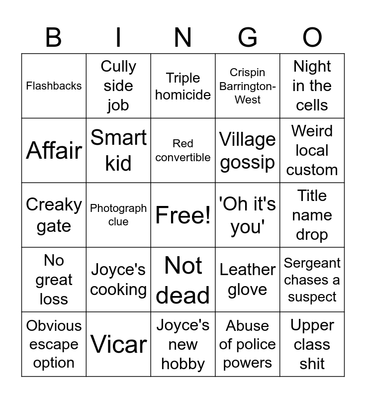 This bingo card has a free space and 39 words: Barnaby family outing, Flirting with the sergeant, Repeated actor, Smart kid, Obvious escape option, Not dead, Red convertible, Village weirdo, Night in the cells, No great loss, Photograph clue, Crispin Barrington-West, Upper class shit, Title name drop, 'Oh it's you', Joyce's cooking, Horses, Flashbacks, Solicitor!, Leather glove, Affair, Joyce's new hobby, Village gossip, Weird local custom, Fete/Fair, Unusual murder weapon, Aha!, Bicycle, Bookshop, Cully side job, Pubquiries, Barnaby's plans interrupted, Triple homicide, Vicar, Abuse of police powers, Gardening, Sergeant chases a suspect, Creaky gate and 'Tea?'.