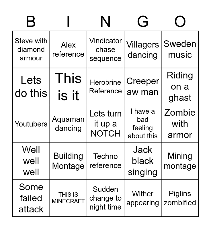 This bingo card has a free space and 24 words: Building Montage, THIS IS MINECRAFT, Herobrine Reference, Some failed attack, Sweden music, Steve with diamond armour, Lets do this, Alex reference, I have a bad feeling about this, Techno reference, Creeper aw man, Youtubers, Jack black singing, Mining montage, This is it, Wither appearing, Zombie with armor, Vindicator chase sequence, Riding on a ghast, Aquaman dancing, Piglins zombified, Well well well, Villagers dancing and Sudden change to night time.