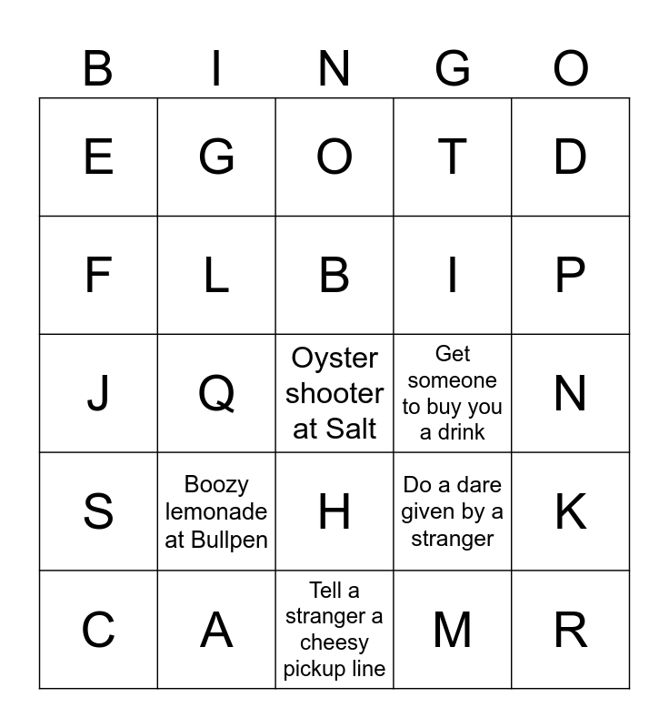 This bingo card has a free space and 24 words: Boozy lemonade at Bullpen, A, B, C, D, E, F, G, Get someone to buy you a drink, H, I, J, Do a dare given by a stranger, K, L, M, N, O, P, Q, R, S, T and Tell a stranger a cheesy pickup line.