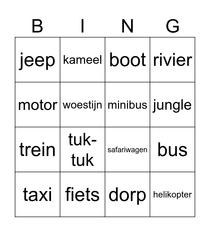 This bingo card has 20 words: bus, vliegtuig, boot, kano, taxi, motor, fiets, jeep, trein, kameel, tuk-tuk, safariwagen, woestijn, helikopter, minibus, vrachtwagen, jungle, rivier, dorp and stad.