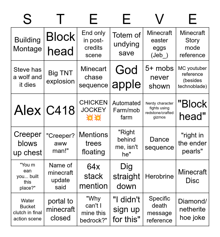 This bingo card has 36 words: Dig straight down, 64x stack mention, "I didn't sign up for this", Steve has a wolf and it dies, Creeper blows up chest, Automated Farm/mob farm, Big TNT explosion, "Why can't I mine this bedrock?", Minecraft easter eggs (Jeb_), Herobrine, MC youtuber reference (besides technoblade), Totem of undying save, Minecraft Disc, C418, God apple, Building Montage, "You mean you... built this place?", Nerdy character fights using redstone/crafted gizmos, Alex, End only in post-credits scene, CHICKEN JOCKEY 💥💥, "Creeper? aww man!", "Right behind me, isn't he", Mentions trees floating, Dance sequence, Block head, 5+ mobs never shown, portal to minecraft closed, Minecart chase sequence, Minecraft Story mode reference, Diamond/ netherite hoe joke, Water Bucket clutch in final action scene, "right in the ender pearls", "Block head", Name of minecraft update said and Specific death message reference.