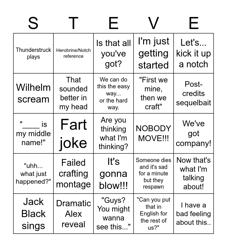 This bingo card has a free space and 37 words: It's quiet... too quiet., Let's get outta here!!!, "He's right behind me, isn't he?", That sounded better in my head, Now that's what I'm talking about!, Failed crafting montage, We can do this the easy way... or the hard way., Aww man!, Let's... kick it up a notch, Is that all you got?, Fart joke, I'm just getting started, I have a bad feeling about this.., We've got company!, Wilhelm scream, "uhh... what just happened?", Right in the ender pearls!, Is that all you've got?, It's gonna blow!!!, NOBODY MOVE!!!, Thunderstruck plays, Post-credits sequelbait, Jack Black sings, "Guys? You might wanna see this...", Minecart chase, "Can you put that in English for the rest of us?", Herobrine/Notch reference, Two characters scare and scream at each other, Mess up a portal at some point, Youtuber reference/cameo, "Kiss my axe!", Dramatic Alex reveal, "____ is my middle name!", "If I was an end portal... where would I be?", Someone dies and it's sad for a minute but they respawn, "First we mine, then we craft" and "Maybe the real diamonds were the friends we made along the way".
