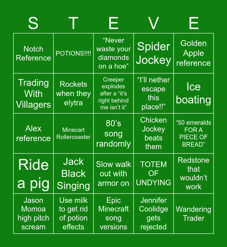 This bingo card has 25 words: Jack Black Singing, Epic Minecraft song versions, Creeper explodes after a “it’s right behind me isn’t it”, Jason Momoa high pitch scream, Golden Apple reference, Notch Reference, Trading With Villagers, POTIONS!!!!, Chicken Jockey beats them, Slow walk out with armor on, “I’ll nether escape this place!!”, Alex reference, TOTEM OF UNDYING, Redstone that wouldn’t work, Rockets when they elytra, Wandering Trader, “50 emeralds FOR A PIECE OF BREAD”, “Never waste your diamonds on a hoe”, Ice boating, Minecart Rollercoaster, 80’s song randomly, Use milk to get rid of potion effects, Ride a pig, Spider Jockey and Jennifer Coolidge gets rejected.