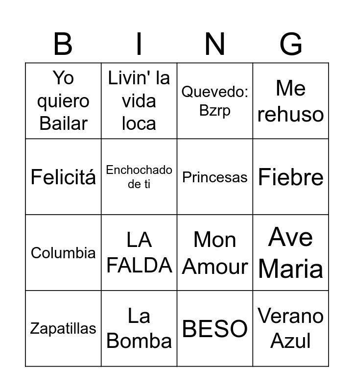This bingo card has 31 words: Free!, Cuando zarpa el amor, Ave Maria, Por la raja de tu falda, Yo quiero Bailar, Quevedo: Bzrp, Princesas, Ay mamá, La Bomba, DESPECHÁ, BESO, Zapatillas, Si antes te hubiera conocido, Sará perché ti amo, LA FALDA, Marta, Sebas, Guille y los demás, Danza Kuduro, Purpurina, Verano Azul, Tusa, Felicitá, Levels- Radio edit, Los lugares donde irás, Livin' la vida loca, Columbia, Enchochado de ti, Me rehuso, Mon Amour, Tití me preguntó, Fiebre and REAL GANSGSTA LOVE.