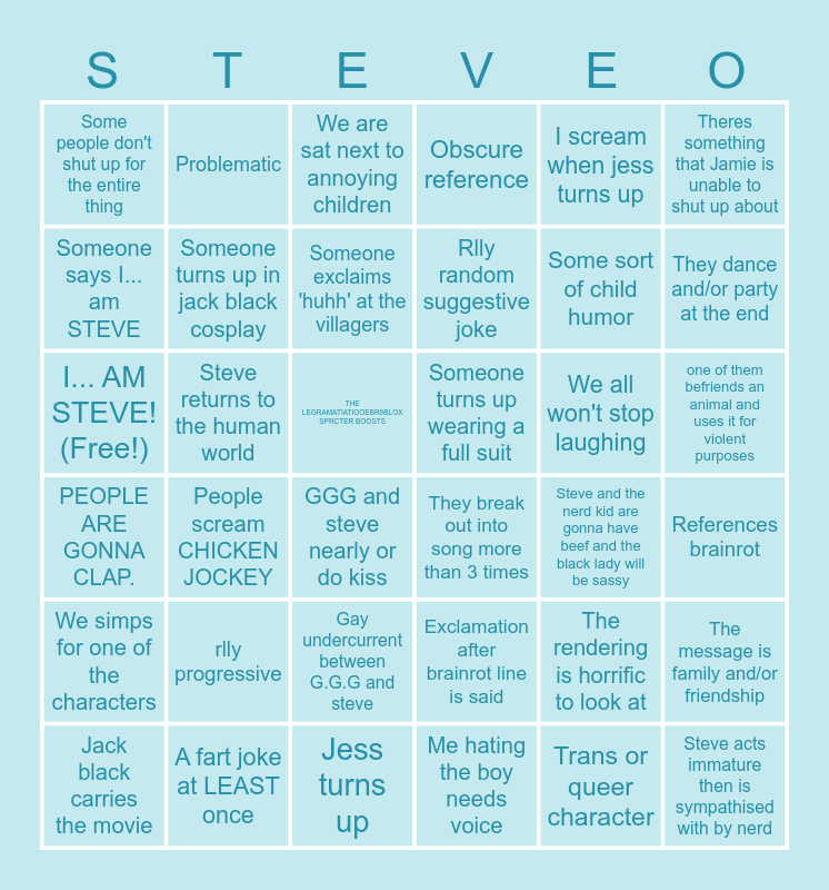 This bingo card has 36 words: Exclamation after brainrot line is said, Gay undercurrent between G.G.G and steve, Me hating the boy needs voice, Someone says I... am STEVE, PEOPLE ARE GONNA CLAP., Someone turns up wearing a full suit, Someone turns up in jack black cosplay, Jess turns up, I scream when jess turns up, The rendering is horrific to look at, They dance and/or party at the end, Obscure reference, The message is family and/or friendship, Steve returns to the human world, Rlly random suggestive joke, Some people don't shut up for the entire thing, We simps for one of the characters, We all won't stop laughing, I... AM STEVE! (Free!), We are sat next to annoying children, THE LEGRAMATIATIOOEBR9BLOX SPRCTER BOOSTS, People scream CHICKEN JOCKEY, They break out into song more than 3 times, GGG and steve nearly or do kiss, Steve and the nerd kid are gonna have beef and the black lady will be sassy, Problematic, Some sort of child humor, A fart joke at LEAST once, Someone exclaims 'huhh' at the villagers, Theres something that Jamie is unable to shut up about, Steve acts immature then is sympathised with by nerd, Jack black carries the movie, References brainrot, one of them befriends an animal and uses it for violent purposes, rlly progressive and Trans or queer character.