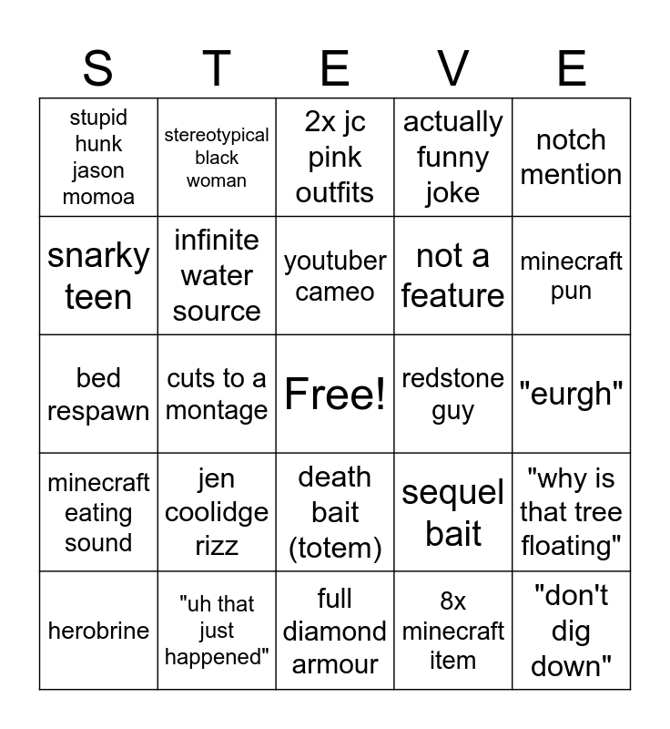 This bingo card has a free space and 24 words: jen coolidge rizz, "uh that just happened", youtuber cameo, herobrine, notch mention, stupid hunk jason momoa, snarky teen, stereotypical black woman, redstone guy, death bait (totem), not a feature, bed respawn, sequel bait, "why is that tree floating", infinite water source, 8x minecraft item, "eurgh", 2x jc pink outfits, minecraft pun, cuts to a montage, "don't dig down", minecraft eating sound, actually funny joke and full diamond armour.