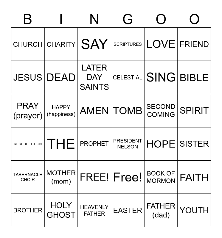 This bingo card has 36 words: Free!, FREE!, EASTER, JESUS, RESURRECTION, TOMB, DEAD, HEAVENLY FATHER, LOVE, BOOK OF MORMON, BIBLE, SCRIPTURES, FAITH, HAPPY (happiness), CELESTIAL, CHURCH, TABERNACLE CHOIR, SECOND COMING, PRAY (prayer), SAY, AMEN, THE, PRESIDENT NELSON, PROPHET, HOPE, CHARITY, SING, HOLY GHOST, LATER DAY SAINTS, FRIEND, YOUTH, BROTHER, SISTER, SPIRIT, MOTHER (mom) and FATHER (dad).