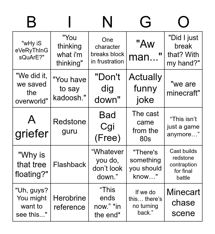 This bingo card has a free space and 58 words: “We’ve got company.”, Herobrine reference, "right behind me, isn't he?", "Why is that tree floating?", If we do this… there’s no turning back.”, “This just got a whole lot more complicated.”, "You have to say kadoosh.", "This is my home now.", Actually funny joke, "Who's Steve?", "Aw man...", Alex shows up, Cast build fortress in preparation for the final battle, Cast can respawn, Steve eats food quickly gag, "wHy iS eVeRyThInG sQuArE?", Minecart chase scene, "Did I just break that? With my hand?", "So let me get this straight...", "Don't dig down", The cast came from the 80s, One character breaks block in frustration, "Uh, guys? You might want to see this...", Cast builds redstone contraption for final battle, "I have a bad feeling about this", “This isn’t just a game anymore…”, *animal dies* "Noooooooo", Youtuber reference, "we are minecraft", Dirt house, Building montage, “This land was built… block by block…", "Half a Heart", Cinema cheers, Subtle adult joke, Jack black sings, "Is that boss music?", Redstone guru, A griefer, Nerd pole, Flashback, Don’t you die on me!!”, "There's something you should know…", "What could possibly go wrong?”, "Looks like we've only got one shot", “I didn’t sign up for this.”, “That went well”, “Whatever you do, don’t look down.”, “This ends now.” *in the end*, “You can’t mine your way out of this one.”, Bedrock, "Don't mine at night", Holy Craft, "Lets turn it up a notch", "You thinking what i'm thinking", "Be there of be square", "We did it, we saved the overworld" and Ancient artifact.