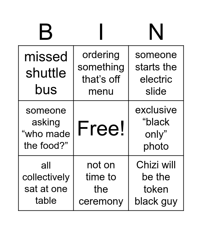 This bingo card has a free space and 8 words: exclusive “black only” photo, someone starts the electric slide, ordering something that’s off menu, all collectively sat at one table, missed shuttle bus, Chizi will be the token black guy, someone asking “who made the food?” and not on time to the ceremony.