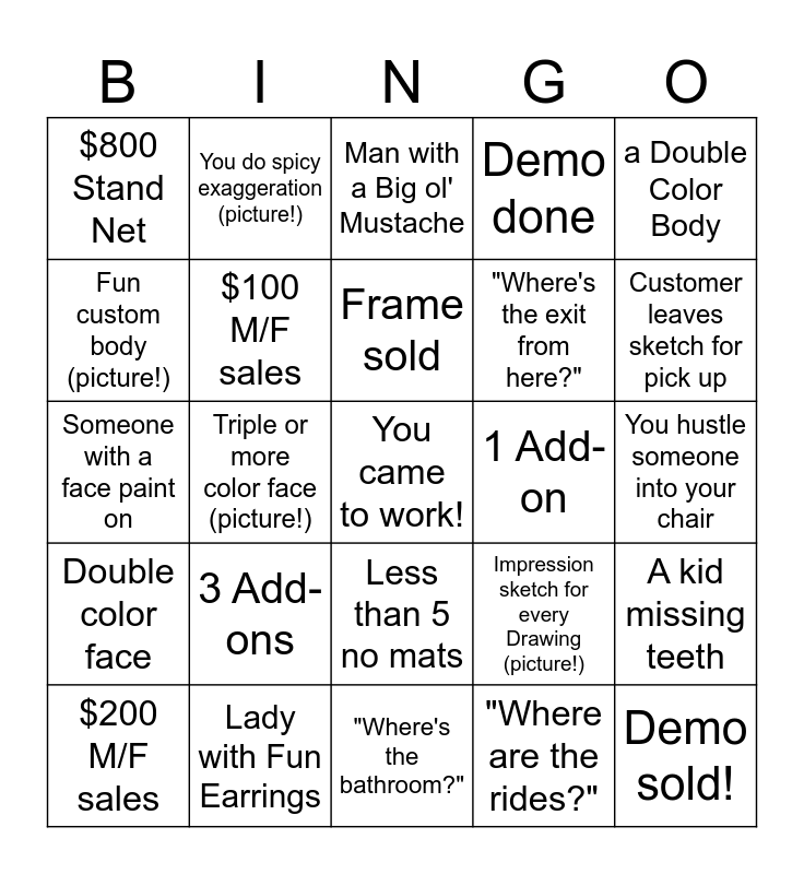 This bingo card has a free space and 39 words: $300 in sales, $500 in sales, $800 in sales, $100 M/F sales, $200 M/F sales, Less than 5 no mats, Frame sold, 5 Mats sold, a Double Color Body, Double color face, Triple or more color face (picture!), Demo done, Demo sold!, You hustle someone into your chair, 1 Add-on, 3 Add-ons, 5 Add-ons, $800 Stand Net, $1000 Stand Net, Impression sketch for every Drawing (picture!), Fun custom body (picture!), "Where's the bathroom?", "Where's the exit from here?", Customer leaves sketch for pick up, "Where can I get a funnel cake/turkey leg?", Where can I get dippin' dots?, You do warm up drills, A crowd forms behind you, People walking by start laughing at your sketch, You do spicy exaggeration (picture!), Someone wearing a hat, Someone who doesn't take off their sunglasses, Man with a Big ol' Mustache, Lady with Fun Earrings, "Where are the rides?", "My eyes are blue/green/grey depending on the light/day", A kid missing teeth, Someone with a face paint on and Draw a Pet in a sketch.