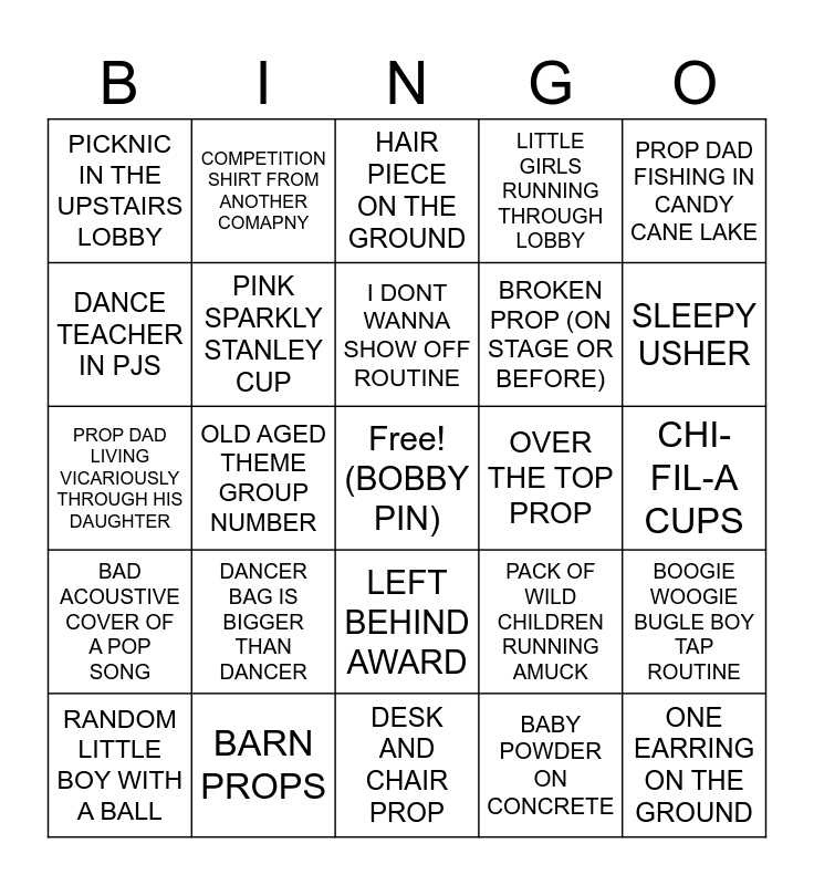 This bingo card has a free space and 54 words: TERRIFIED MUSIC STUDENT, BAD ACOUSTIVE COVER OF A POP SONG, ABANDONED JAZZ SHOE, MOM LIVING VICARIOUSLY THROUGH HER DAUGHTER, LEFT BEHIND AWARD, SLEEPY GRANDMA, LITTLE GIRLS RUNNING THROUGH LOBBY, PROP DAD TAILGATE, DANCE TEACHER IN PJS, ANGRY MOM WITH STARBUCKS, PICKNIC IN THE UPSTAIRS LOBBY, PANCAKE TUTU (NOT ON POINTE), BARN PROPS, RANDOM LITTLE BOY WITH A BALL, BOX TRUCK FULL OF PROPS, DESK AND CHAIR PROP, ONE EARRING ON THE GROUND, BROKEN PROP (ON STAGE OR BEFORE), MATCHING PROP DAD SHIRTS, CHI-FIL-A CUPS, PACK OF WILD CHILDREN RUNNING AMUCK, CRYING DANCER, OVER THE TOP PROP, PROP DAD FISHING IN CANDY CANE LAKE, CAGE PROPS, COMPETITION SHIRT FROM ANOTHER COMAPNY, PRODUCTION PIECE WITH A ZILLION FEATHERS, FALSE FIRE ALARM, DANCER GOT SICK BACKSTAGE, BABY POWDER ON CONCRETE, SOMEONE CARRYING A TINY DOG, BOAT PROP, OPEN CONTAINER, CROSS PROP, HAIR PIECE ON THE GROUND, GIANT HIGH HEEL SHOE CHAIR, PROP DAD LIVING VICARIOUSLY THROUGH HIS DAUGHTER, BOOGIE WOOGIE BUGLE BOY TAP ROUTINE, LOSE A SHOE MID-DANCE, PINK SPARKLY STANLEY CUP, PHOTO BOMB GROUP PICTURE, COSTUME MALFUNCTION, BROKEN COSTUME RACK, DANCERS MAKING A TIK TOK, DANCER BAG IS BIGGER THAN DANCER, PINK PONY CLUB ROUTINE, DANCERS PRACTICING IN CLOSED AREAS, GRANDPARENTS THAT LOOK LOST, I DONT WANNA SHOW OFF ROUTINE, OLD AGED THEME GROUP NUMBER, SLEEPY USHER, SLEEPY STAGEHAND, DISNEY THEME GROUP NUMBER and PROP THAT IS WAY TO BIG FOR THE STAGE.
