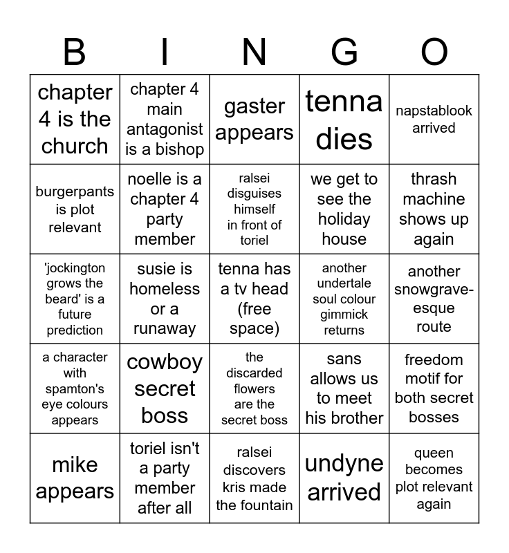This bingo card has a free space and 24 words: mike appears, cowboy secret boss, ralsei disguises himself in front of toriel, undyne arrived, napstablook arrived, chapter 4 is the church, chapter 4 main antagonist is a bishop, gaster appears, another undertale soul colour gimmick returns, another snowgrave-esque route, 'jockington grows the beard' is a future prediction, noelle is a chapter 4 party member, sans allows us to meet his brother, freedom motif for both secret bosses, burgerpants is plot relevant, toriel isn't a party member after all, ralsei discovers kris made the fountain, tenna dies, thrash machine shows up again, a character with spamton's eye colours appears, susie is homeless or a runaway, the discarded flowers are the secret boss, we get to see the holiday house and queen becomes plot relevant again.