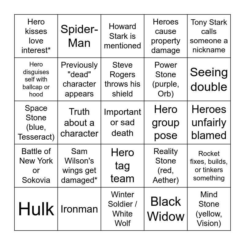 This bingo card has 37 words: James Rhodes' suit gets damaged*, Natasha references her past or ledger, Nebula is helpful, Previously "dead" character appears, Rocket fixes, builds, or tinkers something, Sam Wilson's wings get damaged*, Steve Rogers throws his shield, Thor uses a new weapon, Tony Stark calls someone a nickname, Shirtless hero, Truth about a character, Heroes cause property damage, Important or sad death, Heroes unfairly blamed, Hero disguises self with ballcap or hood, Battle of New York or Sokovia, Hero sacrifices self, Howard Stark is mentioned, Hero tag team, Hero group pose, Hero kisses love interest*, Seeing double, Hulk, Winter Soldier / White Wolf, War Machine, Black Widow, Spider-Man, Star-Lord, Falcon, Captain America, Black Panther, Ironman, Space Stone (blue, Tesseract), Mind Stone (yellow, Vision), Reality Stone (red, Aether), Power Stone (purple, Orb) and Time Stone (green, Eye of Agamotto).